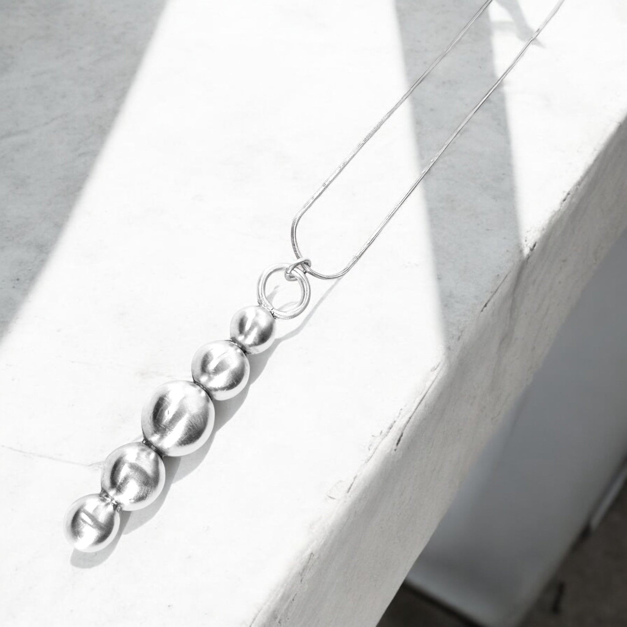 Once part of an old brooch, these hollow sphere forms now fall in a silver constellation—quiet, polished, and full of presence. Suspended from a long, substantial chain, this reclaimed piece feels both futuristic and storied.